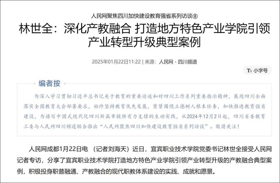 2025年,时任学院党委书记林世全接受人民网记者专访,分享宜宾职业技术学院打造地方特色产业学院引领产业转型升级的产教融合典型案例